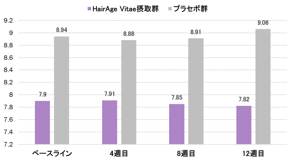 12週目の測定では、グループ間で有意差があり、HairAge Vitae™摂取群では後退が少ないことが示された。また、生え際の毛髪の成長が示唆されている。